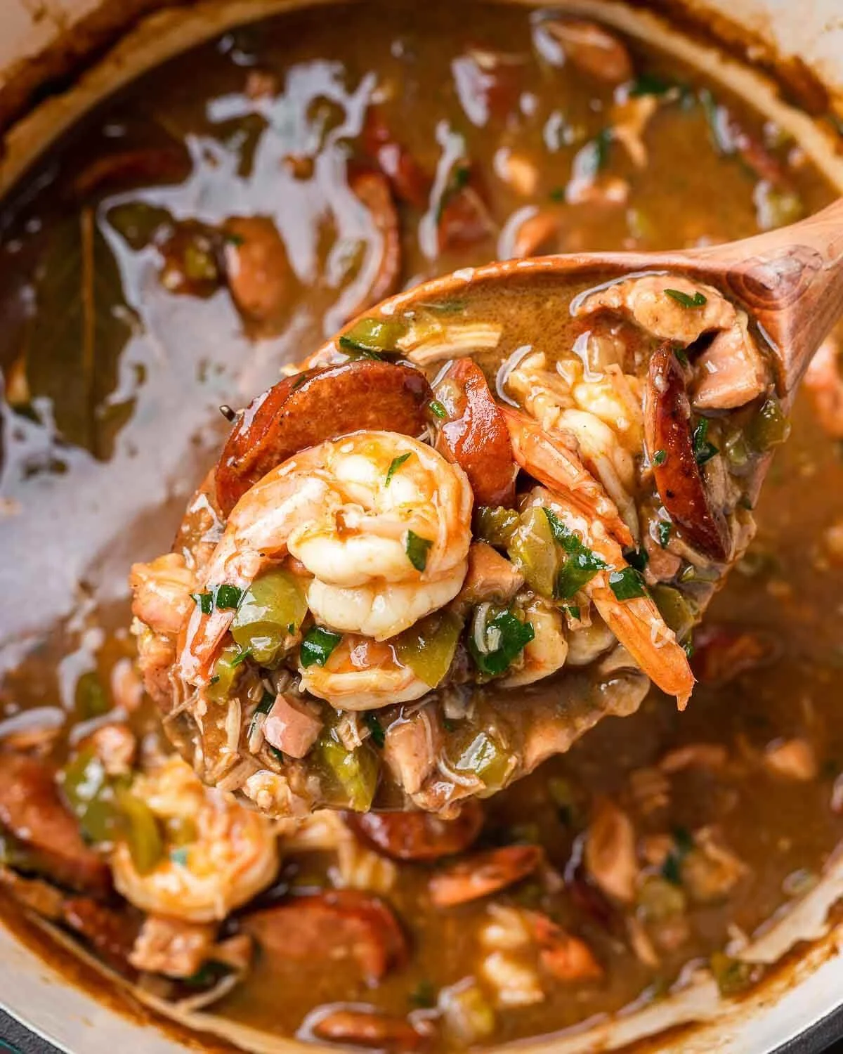 Shrimp + Sausage Gumbo Meal. Pre-order and pay online today. We will have your complete family meal packed up in disposable containers, ready to be enjoyed at home.