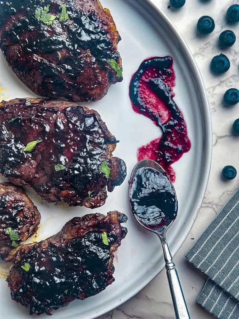 BBQ CHICKEN DINNER MENU: with blueberry chipotle sauce; flatbread with grilled corn, Italian sausage, smoked mozzarella, red pepper and red onion; corn muffins; lemon cake cookies with lemon glaze for dessert!