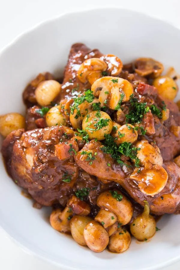 Coq au Vin Dinner. Pre-order and pay online today. We will have your complete family meal packed up in disposable containers, ready to be enjoyed at home.